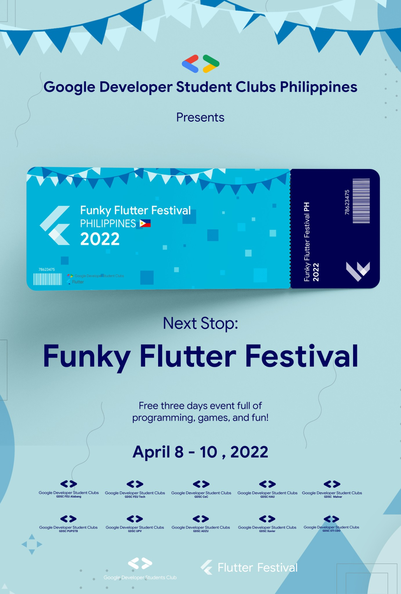 And that’s exactly the goal of Funky Flutter PH Festival2022. Organized by Google Developer Student Clubs, the festival aims to encourage students to learn all about Flutter, be familiarized with Dart, and participate in hands-on workshops, and get to know all about Firebase and Cloud. Held between April 8 to 10, the festival features speakers with varying expertise from all over the Information and Technology industry.